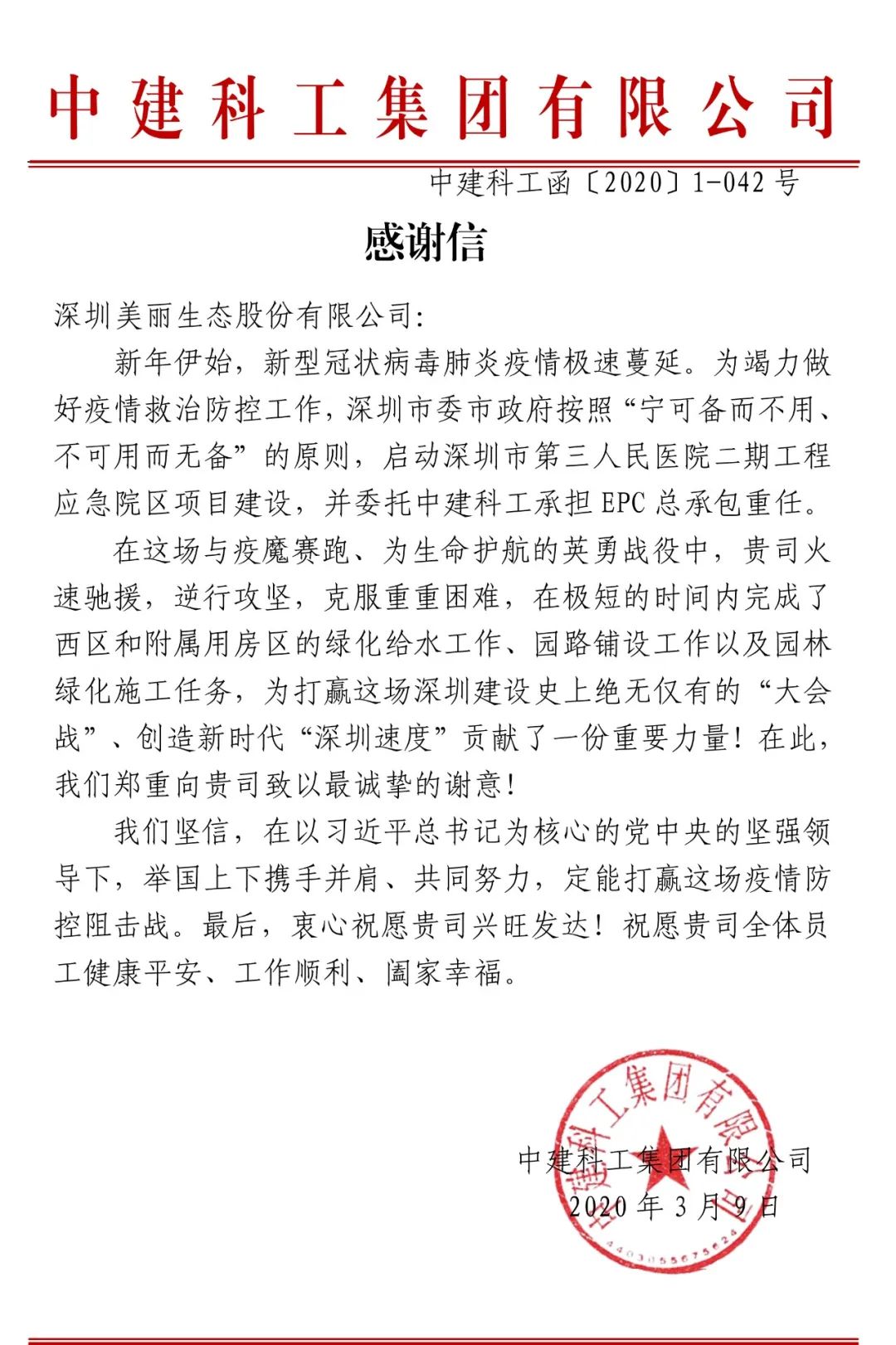 近日,中建科工集团有限公司致信九州酷游,感谢九州酷游在疫情期间全力援建深圳市第三人民医院二期工程应急园区项目,对特殊时期高效完成项目地西区和附属用房的绿化给水、园路铺设、园林绿化工作中体现的责任与担当给予肯定,并对九州酷游在防疫抗疫工作中所付出的不懈努力和贡献表示衷心的感谢。