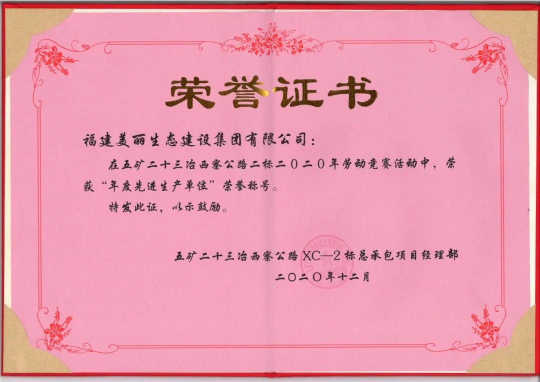 荣获二〇二〇年“年度先进生产单位”荣誉证书