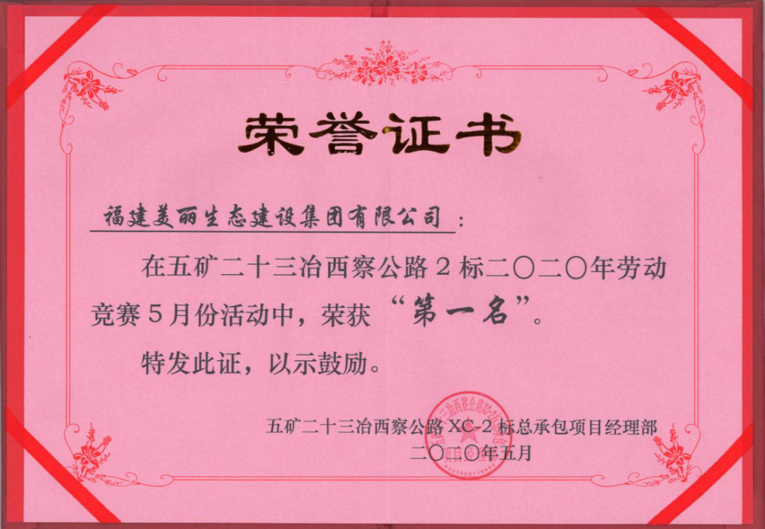荣获五月份劳动竞赛“第一名”荣誉证书